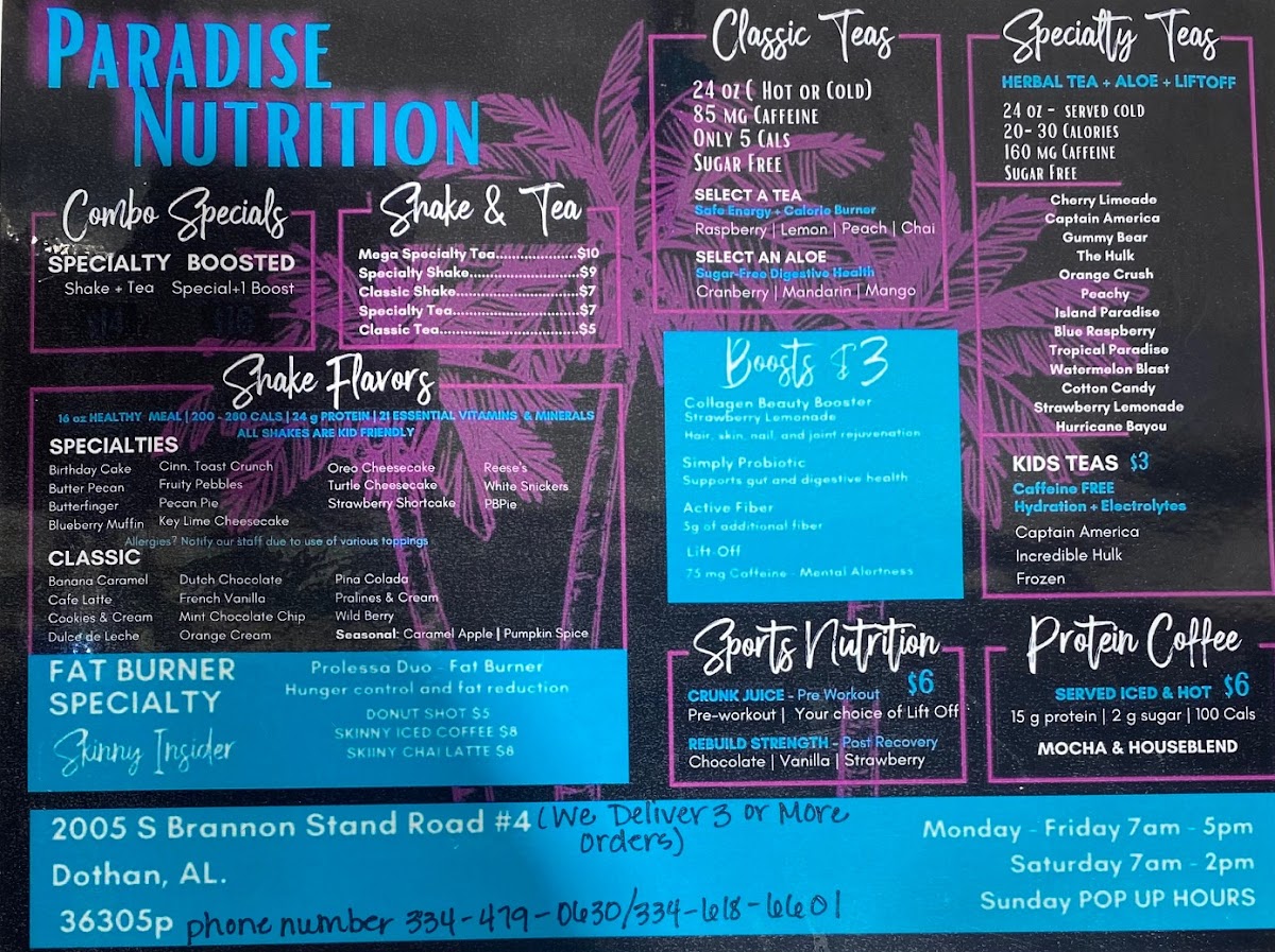 Welcome to Paradise Wellness and Nutrition, a hidden gem at 2005 S Brannon Stand Rd Suite 4 in Dothan, AL. Known for its inviting atmosphere, this wellness haven specializes in energizing teas that not only tantalize the taste buds but also promote health and vitality.